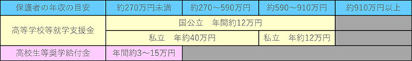 「高校の学費は無償化されているはずだから大丈夫!」と考える人もいるでしょう。確かに高等学校等就学支援金制度(詳しくは後述)により、保護者の所得が年収910万円(目安)より下であれば、公立高校授業料相当額の11万8,800円(年間)が支給されます。さらに生活保護世帯または年収270万円未満の保護者は、授業料以外の教育費を支援してくれる高校生等奨学給付金(詳しくは後述)の給付も受けられます。とはいえ上記表の通り、高校では学校外での費用もそれなりに必要です。無償化されているからと安心しないほうが良いかもしれません。