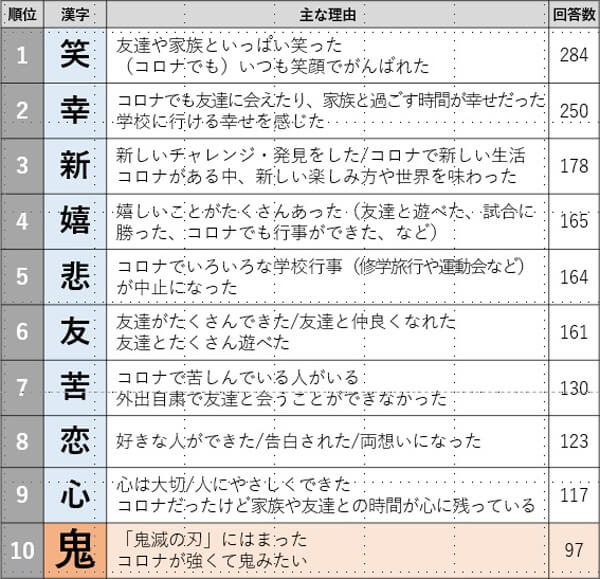 選んだ理由の中には「コロナが強くて鬼みたい」というものもありましたが、「鬼」という漢字を思い浮かべたのには、やはり人気アニメ「鬼滅の刃」の影響が大きいのではないかと推測できます。