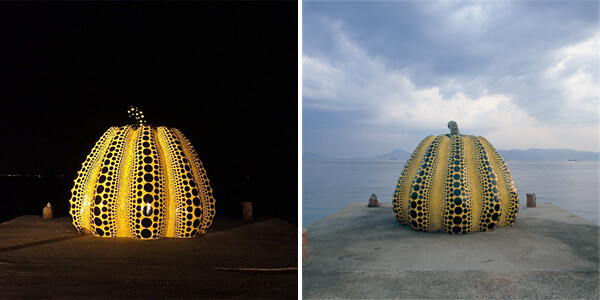 日没時間が早まる冬。「南瓜」のある突堤周辺は、昼間は行き交う人々で賑わいますが、夜になると人影がほとんど見当たりません。波と風の音、ときどき船の汽笛も聞こえ、ゆったりとした静かな時間が流れます。宵闇に浮かび上がるような黄色い南瓜と黒いドットは、明るい太陽の元で見るときとはまるで違う作品のようにすら感じられます。「光」と「闇」の対比は、ベネッセアートサイト直島の持つ魅力のひとつでもあります。