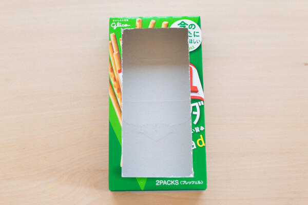 1. まず、ビー玉が転がる「コロコロスタート」を作ります。スティック菓子の箱を、縁を1cm程残して写真のように切り抜きます。