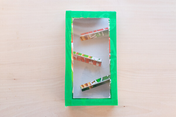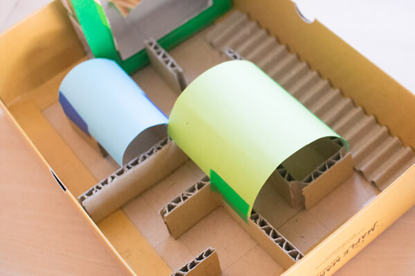15. 「トンネル」を作ります。色画用紙を切り取り、マスキングテープで通路の上に貼り、屋根にします。ビー玉が通る場所をふさがないように、注意しましょう。