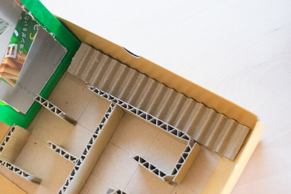 段ボールの配置の仕方を工夫すると、様々な迷路を作ることができます。また、箱を大きくすることで複雑な迷路を作ることもできます。