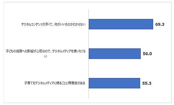 では、幼児がデジタルメディアを使うことについて、おうちのかたはどのように感じているのでしょうか。前述の調査ではいずれも5割以上のかたが、新型コロナの流行前に比べて「デジタルメディアのコンテンツが多くて、何がいいものかわからない」「子どもの健康への影響が心配」「子育てをデジタルメディアに頼ることへの罪悪感」などを感じていると回答(図1)。また2020年9~10月のインタビュー調査では、「視力低下や目の疲れ」「体力の低下」「つい見続けてしまう」などを心配する声も聞かれ、デジタルメディアの活用が進む一方で、健康や使い方についての心配もつきないことがわかります。