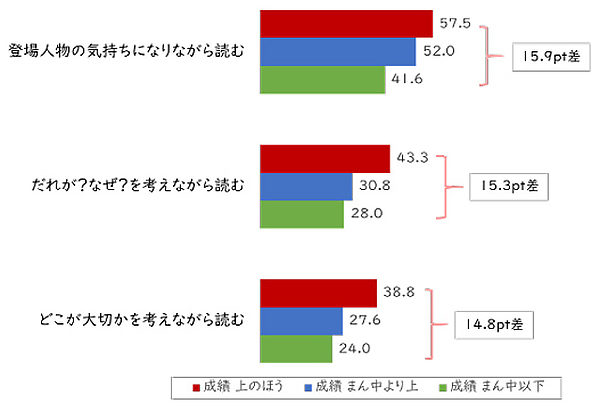 * 図1の読み方「登場人物の気持ちになりながら読む」について、「あてはまる(とても+まあ)」群と「あてはまらない(あまり+まったく)」群に分けた上で、差が大きかった上位3項目を示している。読み方「どこが大切かを考えながら読む」のグラフも同様である。
