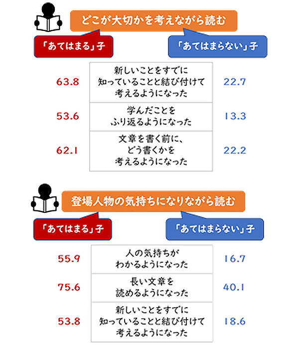 読書をさらに効果的にするならば、本の読み方に着目してみてはいかがでしょうか。データから成績上位の子どもは、「登場人物の気持ちになりながら読む」「だれが?なぜ?を考えながら読む」「どこが大切か考えながら読む」傾向にあります。そうした読み方をしている子どもは、「人の気持ちがわかるようになった」「長い文章が読めるようになった」「新しいことをすでに知っていることと結び付けて考えるようになった」と回答する割合が高いのです(図1・図2)。