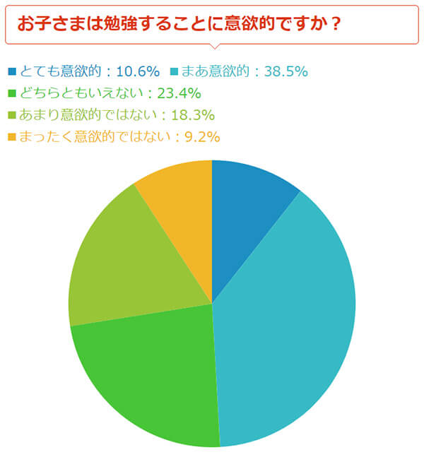 「とても意欲的」「まあ意欲的」と肯定的な回答は、合わせて49.1%でした。一方、「どちらともいえない」「あまり意欲的ではない」「まったく意欲的ではない」と否定的な回答は、合わせて50.9%でした。今回のアンケート結果からは、「やる気がある」お子さまと「やる気がない」お子さまが、ほぼ半々という結果になりました。