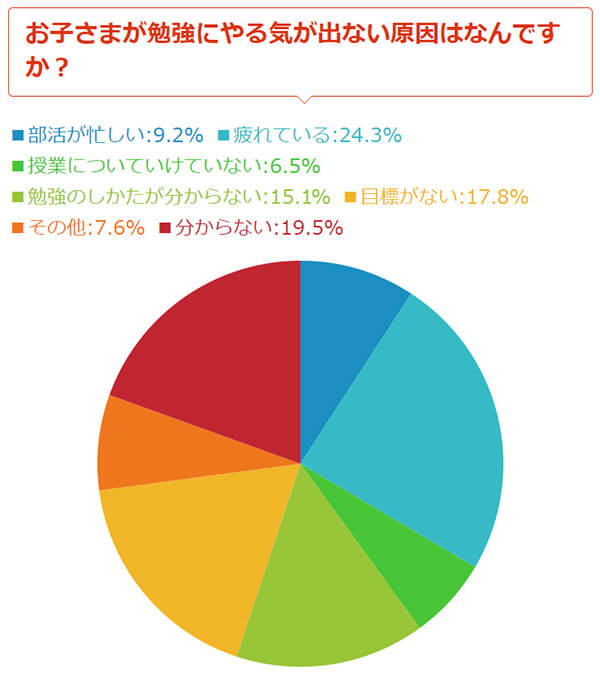 やる気が出ない原因としては、「疲れている」が24.3%と最も多くなりました。他に、「目標がない」(17.8%)、「勉強のしかたが分からない」(15.1%)、「部活が忙しい」(9.2%)、「授業についていけていない」(6.5%)といった理由も見えてきました。