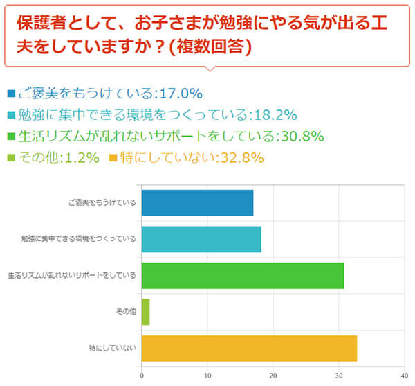 最後に、保護者の方がお子さまのやる気を出すためにしている工夫を聞いた、アンケート結果を見てみましょう。