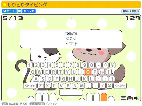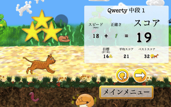 ゲーム終了時には、スコアやレベルだけでなく、1分あたりの打鍵数や苦手キーも教えてもらえるのも魅力。どのくらい上達したかが一目瞭然ですので、毎日の練習メニューとして使いやすいサイトです。
