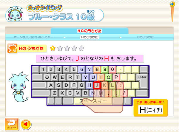 手の置き方や指の使い方が分かりやすく解説されており、日本語のローマ字入力の方法を五十音から文章入力まで段階的に学ぶことができるのが特徴です。