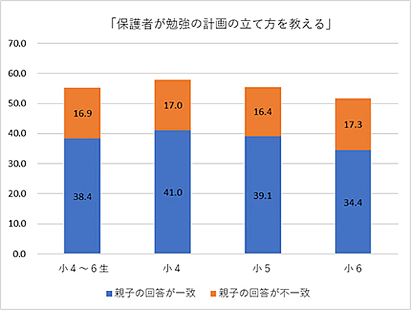 ※「子どもに勉強の計画の立て方を教える」と保護者が回答したうち、子どもも「教えてもらう」と回答したケースを「親子一致」とし、子どもは「教えてもらっていない」と回答したケースを「親子不一致」とした