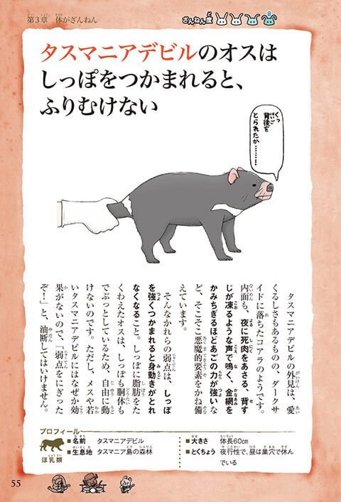 かわいらしい外見と、恐ろしい名前を持つタスマニアデビルがシリーズ初登場。ふっくらした魅力的なしっぽが弱点にもなってしまうんですね。今回の新刊では一番調査がむずかしいいきものだったそう。