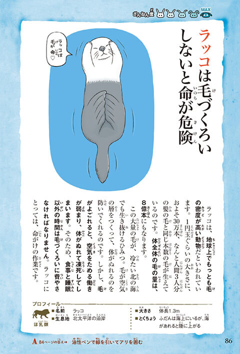 毛づくろいには、見た目のおしゃれ以外の重要な役割がありました。第1弾、第3弾『続々ざんねんないきもの事典』に続いて登場のラッコ。子どもにも大人にも大人気のいきものですが、愛される秘訣は、 “ざんねん”がたくさんあることなのかもしれません。