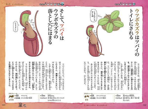 食虫植物ウツボカズラと動物のツパイ。協力関係にあるけれど、注意しないと大変なことに…? 最新刊『ますますざんねんないきもの事典』には、新章“どっちもざんねん”が登場。地球上のいきものはそれぞれの種だけで存在しているわけではありません。環境や他のいきものとの関係がとっても大切なんですね。