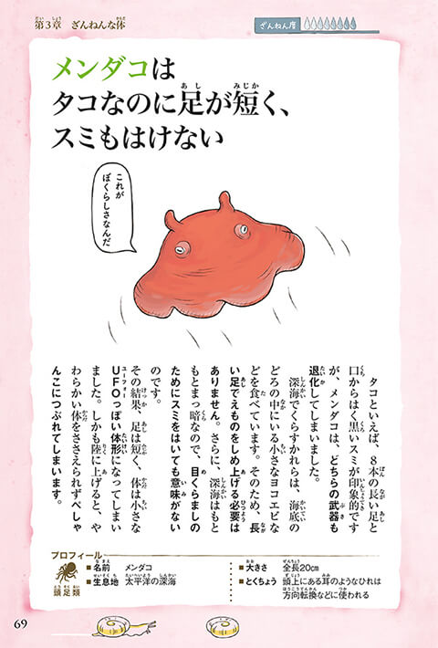 いきものにとっての長所は、住む場所を変えると短所になってしまうこともあります。第2弾『続ざんねんないきもの事典』に登場するメンダコは長い足も持たず、スミもはけません。タコらしくはないけれど、深海に暮らしているので問題なし! “らしく”なくてもいいんです。