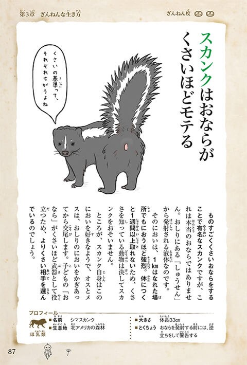 スカンクのくさいおなら(正確にはおならではなく液体)は有名ですが、武器だけではなく、まさかのモテポイントに。得意技も魅力も、いきものそれぞれ。第1弾『ざんねんないきもの事典』に登場しています。