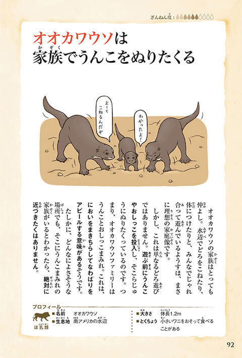 子どもたちに大人気のうんこネタもいっぱい。うんこでどろだんごをつくっても、「うんこで遊んではいけません!」と怒られないオオカワウソの家族は、第3弾『続々ざんねんないきもの事典』に登場します。