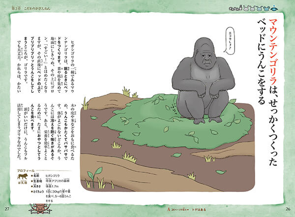 かっこいいゴリラの“ざんねん”なベッドメイキングは、第6弾『ますますざんねんないきもの事典』に登場。人間に近い存在ですが、ゴリラは草食で、うんこはパサパサ。うんこの扱いをまねするのはやめましょう。ちなみにゴリラは第1弾『ざんねんないきもの事典』にもうんこの話で登場します。