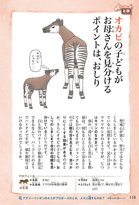 「もし我が家だったら…」と話すと盛り上がりそうな、いきものの家族の姿。第5弾『さらにざんねんないきもの事典』に登場するのは、オカピの子どもがお母さんを見分ける方法。人間にはオカピのおしりの区別はつきませんが、オカピのほうでも「人間のおしりは見分けがつかない!」と思っているかもしれません。