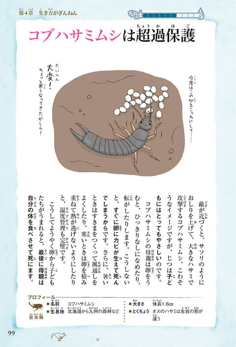 とってもやさしいコブハサミムシのお母さんは、第4弾『もっとざんねんないきもの事典』に登場。いきものはみんな、親が子どもを守りたい気持ちは同じ。シリーズにはいろんな家族の形が登場します。
