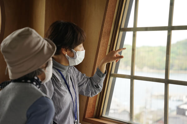 「町政を考える望楼」は、直島町職員もほとんど立ち入る機会のない最上階にあります。窓が四方にあり、城下町の名残を残す本村の集落が見渡せます。