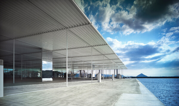 「直島建築鑑賞ツアー」は、直島の玄関口、宮浦港からスタートします。船のターミナルになっている「海の駅なおしま」は、SANAAの設計で2006年に完成した公共建築の一つです。水平に広がる大きな屋根により、海から山につながる直島の風景に馴染み、壁が少なく開放的なデザインになっています。