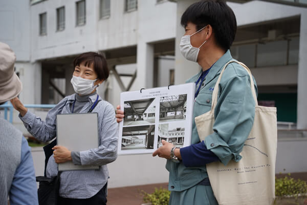 ガイドを務める直島町職員。建設時の小学校の写真も紹介しながら、児童がどんな風に学校生活を送っているのか、実体験を交えながら紹介します。