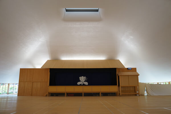 直島町役場に隣接する直島ホールは、三分一博志氏の設計により2015年に完成しました。三分一氏は2年半のリサーチにより本村集落の家々のつくりには南北に抜ける風の流れがあることを発見に着目し、その風を活用した自然エネルギーによる空調の仕組みを考えました。直島ホールの入母屋屋根の風穴は本村集落の風の方向を向いています。風穴を通り抜ける風は、ホール内部との圧力差を生み、内部の空気を引き上げ、自然の力で空気を循環させています。周囲の環境にあった建築デザイン等が評価され、日本建築学会賞、BCS賞、Wallpaper* Design Award、村野藤吾賞の4つの賞を受賞しています。