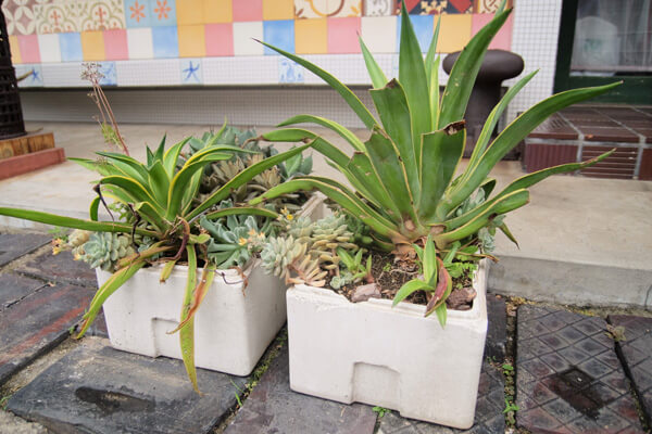 大竹は直島島民の家の軒下で発泡スチロールの箱に植物が植えられている様子を見て、発泡スチロールを模した陶器の箱をつくり、そこに植物を植えたものを入口の手前に置きました。このように島の日常と作品の共存を感じさせるアイデアも隠されています。