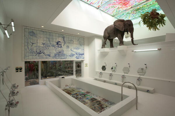 銭湯の中でも一際目立つのは、男湯からも女湯からも見える浴室中央にある大きな象。もともと北海道・定山渓の秘宝館に展示されていたもので、定山渓の「定」の字をとって「定子(サダコ)」と呼ばれています。象のサダコが設置された背景には、島民や来島者が銭湯に親しみをもてるような、誰にでもわかりやすいものが必要であるという大竹の想いがありました。