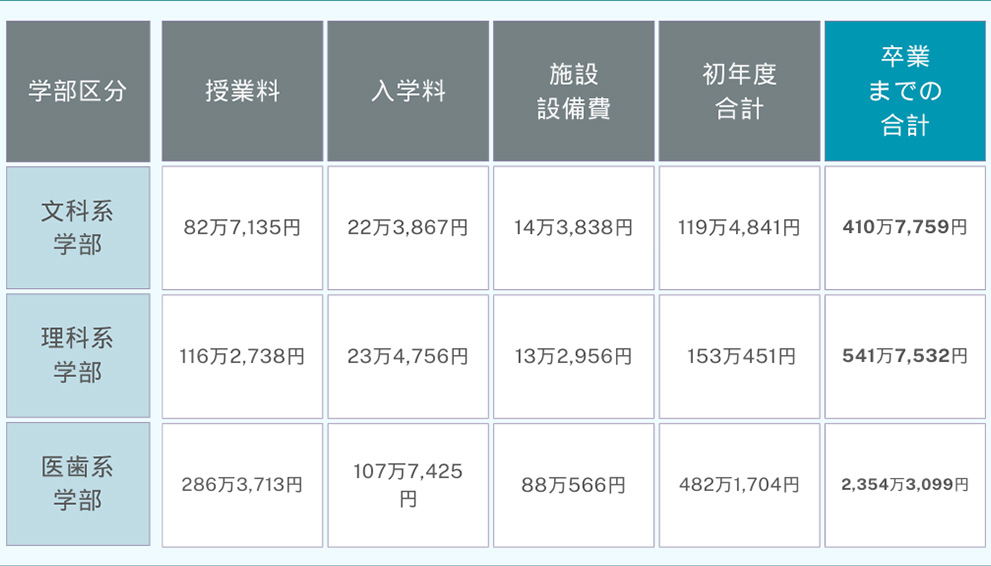 4年間の納付金は、約400万円~650万円(医歯系学部を除く)で学部により差があります。