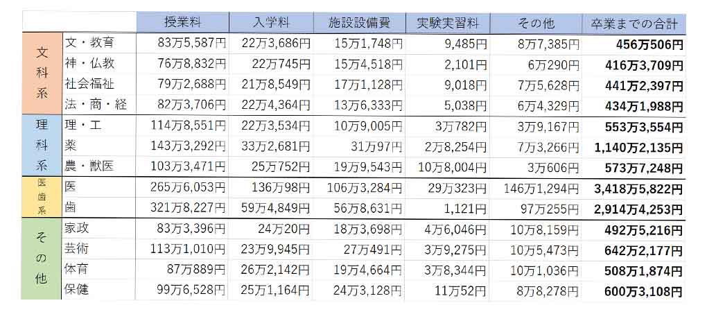 上表は、初年度にかかる入学料と年間の授業料・施設設備費・実験実習料・その他の平均額より、卒業までにかかる費用を学部別に計算したものです。