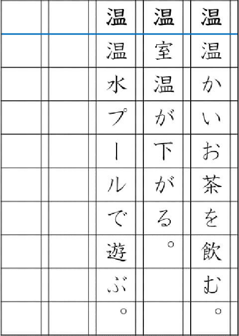 例えば「温」という漢字だと、「温かい」「室温」「温水」などの言葉があります。多様な言葉を使って短文作りをすることで語彙が広がりますし、「こういう表現をしたらおもしろそうだな」、「こういう場面が思い浮かんだから、こういう文にしてみよう」などと考えることで、表現力も身につきます。