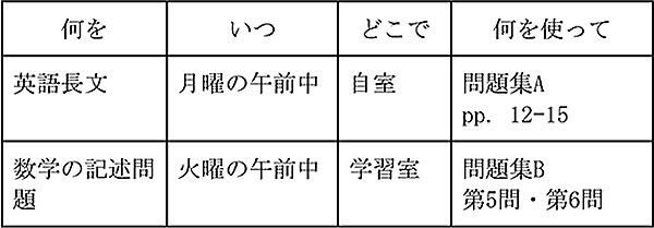 基礎固めが必要な分野、基礎知識は覚えたので基礎問題を解けるようになりたい分野、基礎レベルはクリアして標準問題に進める分野など、各科目または分野について取り組みたいことを目標レベルとともに書き出すのがポイントです。