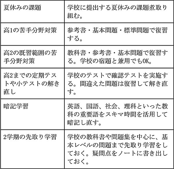 高校2年生の夏休みでは、既習範囲の苦手克服を中心に行い、余裕があれば未習範囲の予習をしておきましょう。