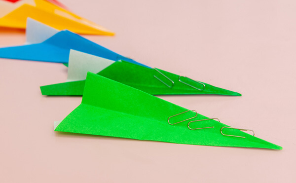 紙飛行機の先端にクリップを付けます。クリップの数を増やすと飛ぶ距離がどう変わるか、飛行の実験。