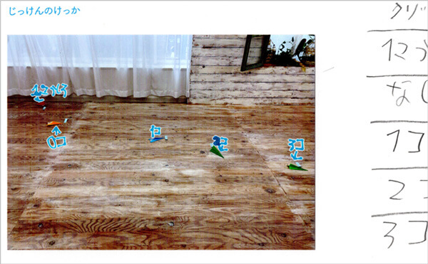 クリップの数を書いた文字を合成して、写真用紙にプリントできました。「こんなこともできるの?」とまさきさん親子もびっくり。合成した写真をまとめ用紙に貼って、飛行距離の図表もグッとわかりやすくなりました。