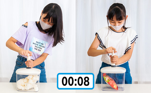 マシュマロと袋菓子で、空気がなくなるとどうなる?を実験します。
