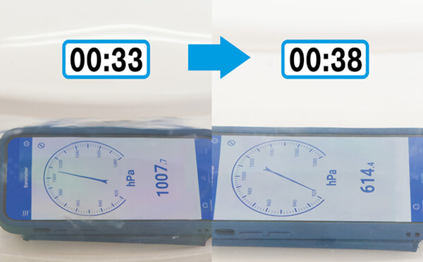 真空容器のなかでは何が起こっているのでしょうか?スマホのアプリで気圧を調べてみると、数値がみるみる変化しました。