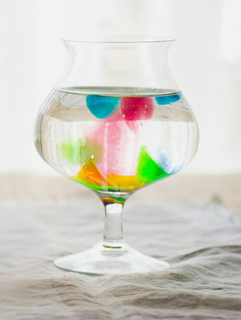 ④ 冷蔵庫に入れて2時間冷やし固める。楊枝で風船を割ったらお皿のでき上がり。