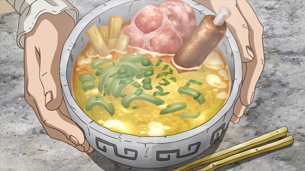 猫じゃらしラーメンは、第1期第8話「STONE ROAD」に登場。村人の協力を得るため、石の世界(ストーンワールド)では誰も食べたことがなかった「ラーメン」を作る千空。「科学関係ねえじゃねぇか」というツッコミには、「飯(メシ)=科学」と答えます。猫じゃらしを脱穀して小麦粉ならぬ猫じゃらし粉にし、ラーメンの麺の材料にした科学のグルメ。そそります。
