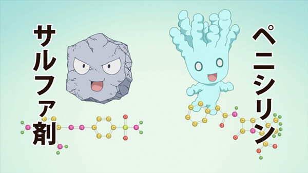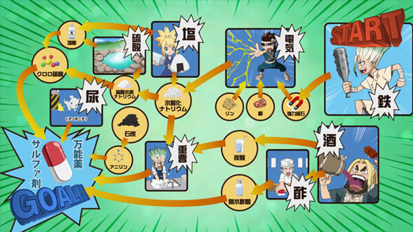超高速で科学文明を取り戻すため、千空たちの科学王国では目標達成のためのロードマップがよく示されます。第1期第8話「STONE ROAD」では、「抗生物質」を作るため、生き物から作るペニシリンと石から作るサルファ剤を検討。石の世界で実現可能性が高いサルファ剤へのロードマップが用意されました。