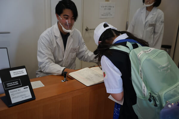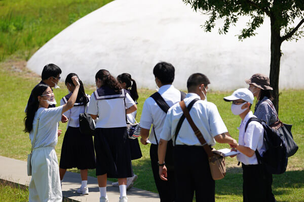 作品を鑑賞する前に、幼い頃から何度も訪れたことのある豊島中学校の生徒たちは、ほとんどが初来館という聾学校の生徒たちに豊島美術館はどういった場所であるかを紹介しました。