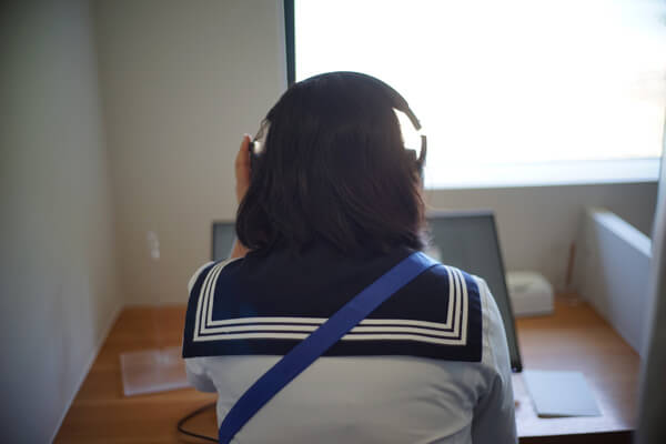 「リスニングルーム」では、これまでに録音された世界中の心臓音を聴くことができます。豊島中学校の生徒は、過去に録音した自分や家族の心臓音を聴く姿が見られました。聾学校の生徒は、心臓音のリズムを豊島中学校の生徒に机をたたいて教えてもらったり、ヘッドフォンにOntennaを当てて振動から心臓音を感じたりと、工夫しながら作品を楽しんでいました。