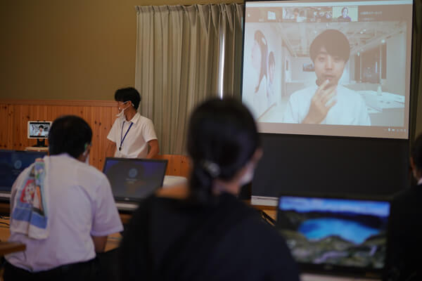まず、Ontennaの開発者である本多達也氏とオンラインでつなぎ、Ontennaの開発のきっかけや活用事例についてお話をうかがいます。開発者本人から直接お話を聞くことができ、生徒たちは興味津々の様子です。