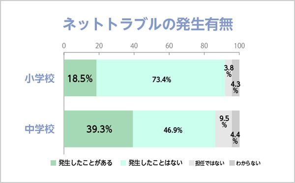 学校貸与端末で、具体的にどのようなトラブルが起きているのでしょうか。一般財団法人LINEみらい財団の「一人一台端末環境におけるICT活用と情報モラル教育の実践に関する調査報告書」(2021年8月)によると、過去一年以内に学級内でネットトラブルが発生した割合は、小学校は18.5%、中学校は39.3%でした。