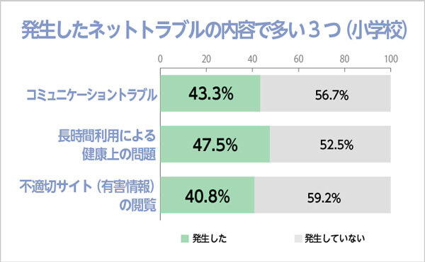 発生したトラブルの内容は、小学校ではコミュニケーショントラブル(43.3%)、長時間利用による健康上の問題(47.5%)、不適切サイト(有害情報)の閲覧(40.8%)が多くなっています。その他、個人情報・プライバシー関連(15.8%)、なりすまし等のネットワーク上の不正行為(10.8%)などトラブルは多岐にわたります。ネットトラブルは、授業中を含む学校内だけでなく、家庭でも起きています。