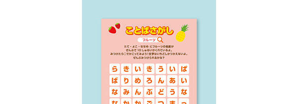 「ことばさがし」は、お子さまが知っている言葉がどのくらいあるかをゲーム感覚で試せる楽しいプリントです。複数のカラーペンを用意して、みつけた言葉をなぞったり、別の用紙にどんどん書き出してご家族で競争したりするのも楽しいでしょう。