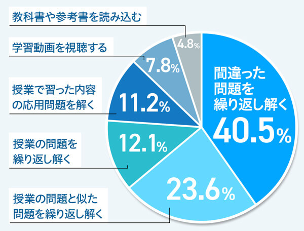 既に学習した分野を繰り返し学習・演習することを「反復学習」と呼びます。アンケート結果で多く見られた学習方法にも反復学習がありました。実際、苦手教科の克服において反復学習はとても大切です。