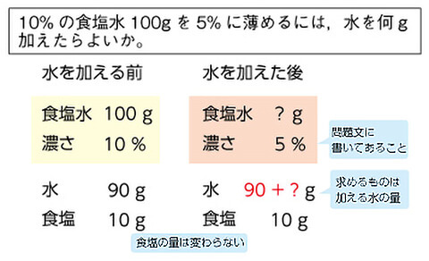 濃さを求める計算問題では「水の量」「溶けているものの量」「割合」のうち、2つの情報は問題文で与えられているか、簡単な計算で求められるはずです。